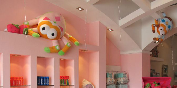 Two little spiders hang on strings from a cursive, neon-style inspired sign by the kindergarten song